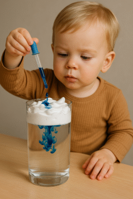 Stellen Sie für jedes Kind ein Glas bereit, das bis zu drei Viertel mit Wasser gefüllt ist. Legen Sie Pipetten, Lebensmittelfarbe und den Rasierschaum griffbereit. Kurz bevor Sie mit den Kindern start...
