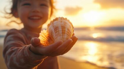 Hier öffnet sich geheimnisvoll eine Muschel und zeigt ihre blitzende Perle.