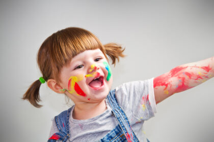 Hier sammeln die Kleinkinder Ganzkörpererfahrung plus Übung im Umgang mit Farbe und Pinsel. Die Selbstwahrnehmung wird bei der Gestaltung und auch später auf dem Foto selbst im Mittelpunkt stehen – erkennt das Kind sich später auf dem Foto wieder?
