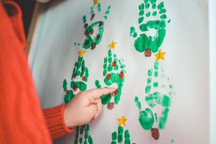 Die buntesten und wildesten Weihnachtsbäume entstehen, wenn die Kleinkinder diese mit ihren Händen und Fingerfarbe auf Tapete drucken. Damit fördern Sie die taktile Wahrnehmung und vielleicht auch schon eine erste Vorfreude auf Weihnachten.