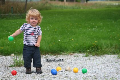 Bei einem Ausflug oder Aufenthalt im Wald Stöcke und Steine zu werfen gehört auch zu den angeborenen Leidenschaften der Kinder. Wer kann am weitesten werfen? – Das ist dabei die zentrale Frage. Das Kugelstoßen ist eine Aktion der Sommer-Olympiade, bei der die Kinder ausnahmsweise mit Gegenständen werfen dürfen.