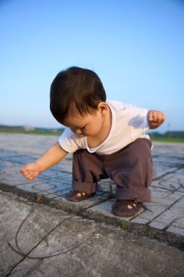 Ab 1,5 Jahren. In diesem Spiel können die Kinder ihrem Entdeckungsdrang freien Lauf lassen. Sie folgen einem Seil und entdecken eine Kiste mit verschiedenen Gegenständen, die sie nach Lust und Laune aus- und einräumen können.