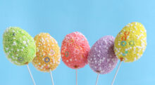 Nach dem Trocknen der Farben werden die Eier von den Spießen genommen. Hängen Sie die bunt verzierten Eier mit Hilfe von grünem Bast an Blütenzweigen auf. Den Bast befestigen Sie am einfachsten mit Stecknadeln an den Styropor-Eiern.