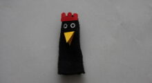 Schneiden Sie von einem alten Handschuh, den Sie nicht mehr tragen möchten, den Zeigefinger ab. Aus der gelben Pappe fertigen Sie den Hühnerschnabel. Dazu knicken Sie die Pappe in der Mitte. Ausgehend vom Faltrand zeichnen Sie mit dem Bleistift ein Dreieck. Die lange Seite des Dreiecks liegt an der Faltlinie und ist ca. 0,5 cm breit. Entlang der Bleistiftlinie schneiden Sie den doppelt gelegten Karton aus. Fertig ist der Schnabel. Den befestigen Sie in der Mitte des oberen Viertels des Fingers, indem Sie mit der Schere 2 kleine Löcher in der Größe des Schnabels in den Stoff schneiden und die beiden Pappdreiecke dort hindurchschieben.