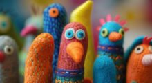 Schneiden Sie von einem alten Handschuh, den Sie nicht mehr tragen möchten, den Zeigefinger ab. Aus der gelben Pappe fertigen Sie den Hühnerschnabel. Dazu knicken Sie die Pappe in der Mitte. Ausgehend vom Faltrand zeichnen Sie mit dem Bleistift ein Dreieck. Die lange Seite des Dreiecks liegt an der Faltlinie und ist ca. 0,5 cm breit. Entlang der Bleistiftlinie schneiden Sie den doppelt gelegten Karton aus. Fertig ist der Schnabel. Den befestigen Sie in der Mitte des oberen Viertels des Fingers, indem Sie mit der Schere 2 kleine Löcher in der Größe des Schnabels in den Stoff schneiden und die beiden Pappdreiecke dort hindurchschieben.
