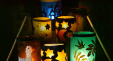 Erschrocken blieb das Mädchen stehen und fragte sich, wie es denn nun, ohne Licht, den Heimweg zurück finden sollte. Mia bekam Angst und fing an zu weinen. Als sie so vor sich hin schluchzte hörte sie auf einmal eine Stimme neben sich: „Warum weinst du denn?“ Verwundert sah Mia sich um und erblickte einen kleinen Jungen, der ebenfalls mit einer Laterne durch den Wald streifte. (Eine weitere erleuchtete Laterne in die Kreismitte stellen)
