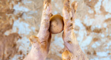 Nehmen Sie mit den Kindern an einem Tisch in der Kreativ-Werkstatt Ihrer Einrichtung Platz, den Sie bereits mit Plastiktischdecken vollständig abgedeckt haben. Schneiden Sie von einem 10-kg-Batzen Scheiben von jeweils etwa 4 cm Breite ab, und verteilen Sie diese an die Kinder. Leiten Sie die Kinder durch folgende Anweisungen bei der Gestaltung der Struktur-Reliefbilder an: