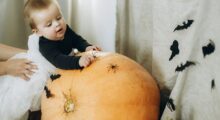 Mit den Fingern oder dem ganzen Körper erkundet das Kind den Kürbis. Indem Sie das Kind dabei sprachlich begleiten, erweitert es seinen Wortschatz und lernt verschiedene Gegenstände passend zum Halloween-Fest kennen.