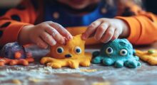 „Ene, mene, Kneterei. Teile die Knete jetzt entzwei, roll 2 runde Kugeln draus. Drück’ sie platt und knete sie wieder auf. Zieh hier, zieh da und schon ist es da: das Monster! Jetzt noch 3, 4 Augen drauf. Das Knetmonster ist fertig und kann auf das Monstertablett hinauf.“
