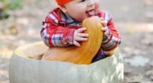 Suchen Sie draußen im Garten eine herbstliche Kulisse und bauen Sie dort das Fotosetting aus einem Kürbis und ggf. einer Decke auf.