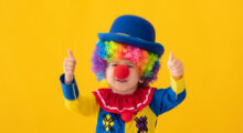 Sprechen Sie den folgenden Spielvers langsam und deutlich vor. Dazu machen Sie die passenden Bewegungen vor: Legen Sie eine Hand über die Augen, als würden Sie Ausschau halten. Zeigen Sie auf Nase und Mund. Schneiden Sie eine Grimasse, stampfen Sie mit den Füßen auf und klatschen Sie zum Schluss. Dann können die Kinder mitsprechen und die Bewegungen mitmachen – vielleicht fallen den Kindern noch weitere lustige Clown-Bewegungen ein.