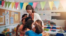 Wenn Sie von jedem Kind eine Nahaufnahme mit einem fröhlichen Gesichtsausdruck haben, drucken Sie die Bilder in DIN-A4-Größe aus. Diese Fotos können Sie dann laminieren. Mit dem Locher bringen Sie 2 Löcher am oberen Bildrand an. Dort hindurch fädeln Sie die Wollschnur. Die Wollschnur können Sie dann mit gut klebendem Tesakreppband an der Wand entlang befestigen. Achten Sie darauf, dass die Kinder die Wollschnur nicht von der Wand reißen, da sie sich darin verheddern oder damit strangulieren könnten.