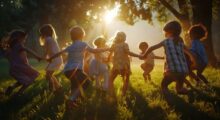 Die beiden Kinder fassen sich an den Händen und tanzen im Kreis herum. |