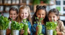 Nun können die Kinder mit Ihrer Hilfe den Smoothie mit der Kelle in die Trinkbecher füllen. Die 2 übrigen Bananen werden geschält und von den Kindern in kleine Stücke geschnitten. Pro Becher können sie 2–3 Bananenstücke auf den Glasrand stecken. Fertig ist der leckere und gesunde Neujahrs-Smoothie. Prost.