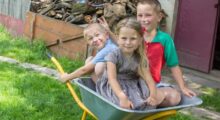 Ein Kind aus der Runde tritt in die Mitte und klettert in die Schubkarre, um dort bequem Platz zu nehmen. Dann hält es sich mit beiden Händen an der Metallwanne der Karre fest.
