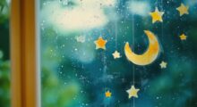 Mit Tesafilm kleben Sie den fertigen Mond und die Sterne an ein freies Fenster. Nach Belieben können die Kinder die restliche Fensterfläche mit blauer Fingerfarbe um den Mond etc. herum bemalen, um die Nacht zu „verdunkeln“.