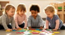 Versammeln Sie sich mit einer Kleingruppe aus maximal 4 Kindern um die auf dem Boden ausgebreiteten Spielgegenstände.