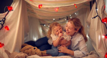 Gemeinsam mit den Kindern bauen Sie die Höhle. Die Kinder können dabei die im Gruppenraum vorhandenen Decken und Kissen zusammentragen. Sie stapeln und spannen die Kissen und Decken und errichten einen Bereich, der vom restlichen Gruppengeschehen abseits liegt. Nun können sich die Kinder hineinkuscheln. Allein, zu zweit oder zu dritt. Je nach Situation können auch Sie dazukommen, wenn die Kinder Ihre Nähe wünschen.