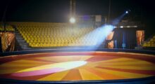 | Auf einem gespannten Seil, fast am bunten Zeltdach, von den Zuschauern hört man ein bewunderndes Oh und ein ängstliches Ach. |