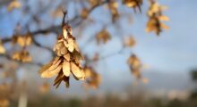 Dann wird zuerst eine kleine bunte Holzperle aufgefädelt. Zur Aufreihung der Ahornsamen benötigt jedes Kind nun ein Schneidebrett, das es vor sich auf den Tisch legt. Darauf wird nun nacheinander ein Ahornsamen gelegt und an der rundlichen Verdickung mit der Nadelspitze durchbohrt und aufgereiht. Nachdem alle Samen auf der Wolle ihren Platz gefunden haben, wird das Fadenende zur Hälfte gelegt und eine Schlaufe geknotet. Mit deren Hilfe lässt sich diese interessante Deko am Fensterrahmen befestigen.