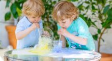 Lassen Sie zunächst die Kinder einen Tisch vollständig mit Zeitungspapier abdecken. In die Mitte des Tisches legen Sie dann sämtliche Materialien für die Kinder übersichtlich bereit. Fordern Sie in aufeinanderfolgenden Arbeitsgängen zum Experimentieren mit dem gefärbtem Wasser auf: