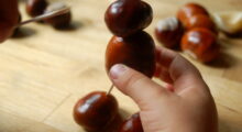 Die Kinder bohren mit dem Kastanienbohrer in jede der gesammelten Kastanien ein Loch, so dass diese auf eine etwa 50 cm lange Schnur aufgefädelt werden können. Damit die Kastanienketten schön abwechslungsreich gestaltet werden, können die Kinder nach eigenen Ideen bunte Holzperlen, eingesammelte und gelochte bunte Herbstblätter o. Ä. abwechselnd mit auffädeln. Die fertigen Ketten hängen Sie mit den Kindern vor die Fenster, an die Zimmerdecke, oder die Kinder können sie auch als Deko auf den Esstisch oder die Fensterbank legen.