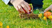 Ein Osterfest ohne das Verstecken von bunten Eiern ist wohl kaum vorstellbar. Beim spaßigen Eiersuchen lassen sich vor allem bunt bemalte Hühnereier entdecken. Nebenbei findet sich aber auch noch allerhand eirundes Naschwerk aus Zucker, Schokolade oder Marzipan. Machen Sie sich mit den Kindern auf die Suche nach den leckeren bunten Geschenken. Erfahren Sie bei einem Fingerspiel, ob es möglich ist, heimlich den Osterhasen bei der Arbeit zu beobachten. Mit einem Paar Einmalhandschuhen erleben Sie eine ganz simple und schnelle Variante des Eierfärbens. Tags darauf stellt ein buntes Schwungtuch das Terrain für eine fröhliche Eiersuche dar. Danach fordert ein Arbeitsblatt mit einem umgekippten Korb zum Suchen, Sortieren und Zählen von bestimmten Eiverzierungen auf. Und für den Fall, dass gar keine Eier gefunden wurden, finden Sie zum Ende der Woche noch eine Anleitung für die Zubereitung von Mogel-Spiegeleiern.